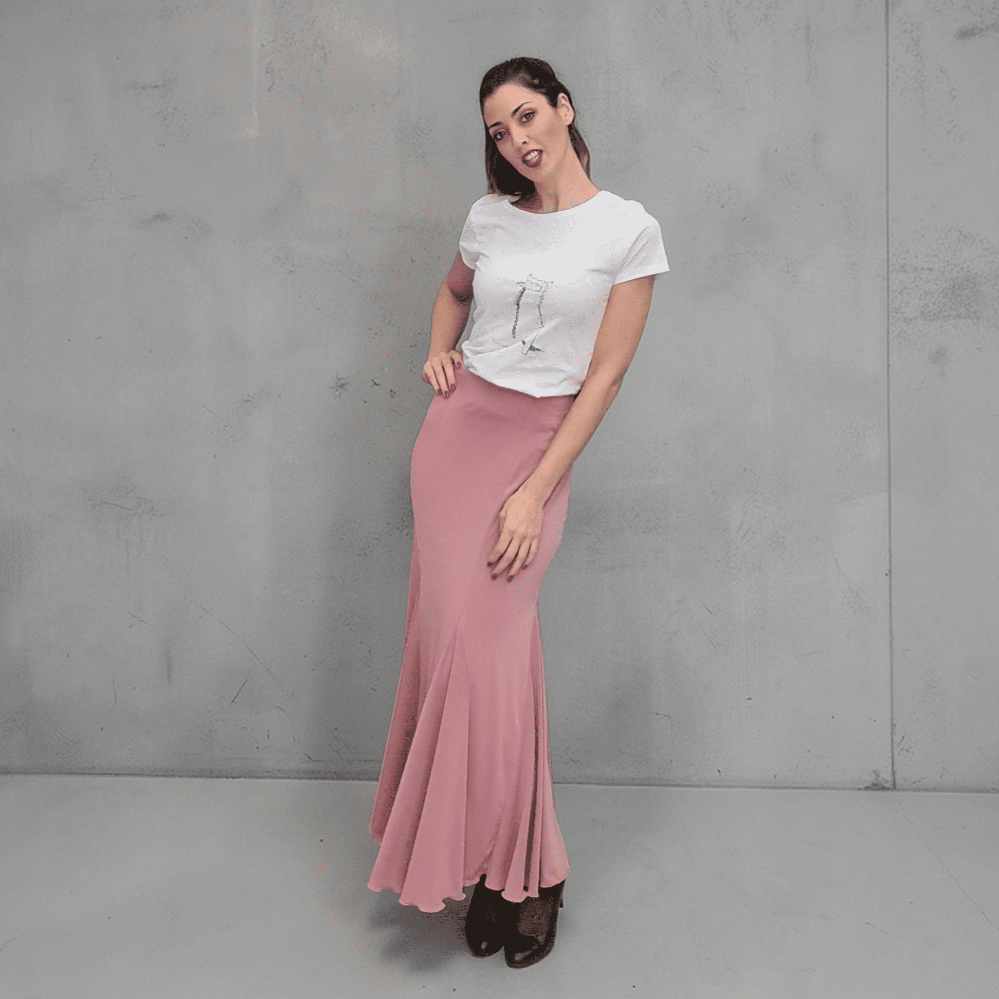 Gracias a su patrón, la falda se adapta bien al cuerpo y permite que los movimientos se vean más limpios y estilizados, algo muy importante cuando se baila flamenco. El vuelo que crea el corte godet ayuda a acompañar cada giro y cada paso, aportando elegancia al conjunto.