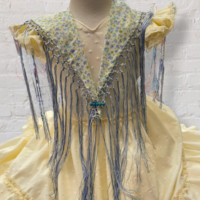 Este mantón mide aproximadamente 98 cm de largo por 27 cm de ancho, una medida ideal para niñas. Lleva un enrejado fino de 1 cm y unos flecos que caen con gracia hasta 22 cm, aportando movimiento y un toque tradicional al conjunto. Su tamaño y forma lo hacen muy fácil de colocar y cómodo de llevar durante todo el día.