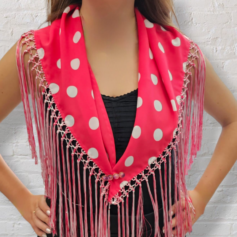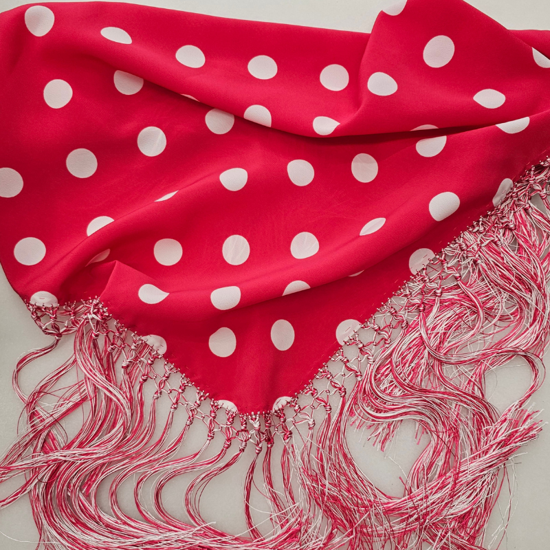 El mantón de lunares en georgette es más que un simple accesorio: es tradición, elegancia y movimiento. Cada fleco, cada lunar, y cada detalle están pensados para realzar la belleza de quien lo lleva y mantener viva la esencia andaluza.