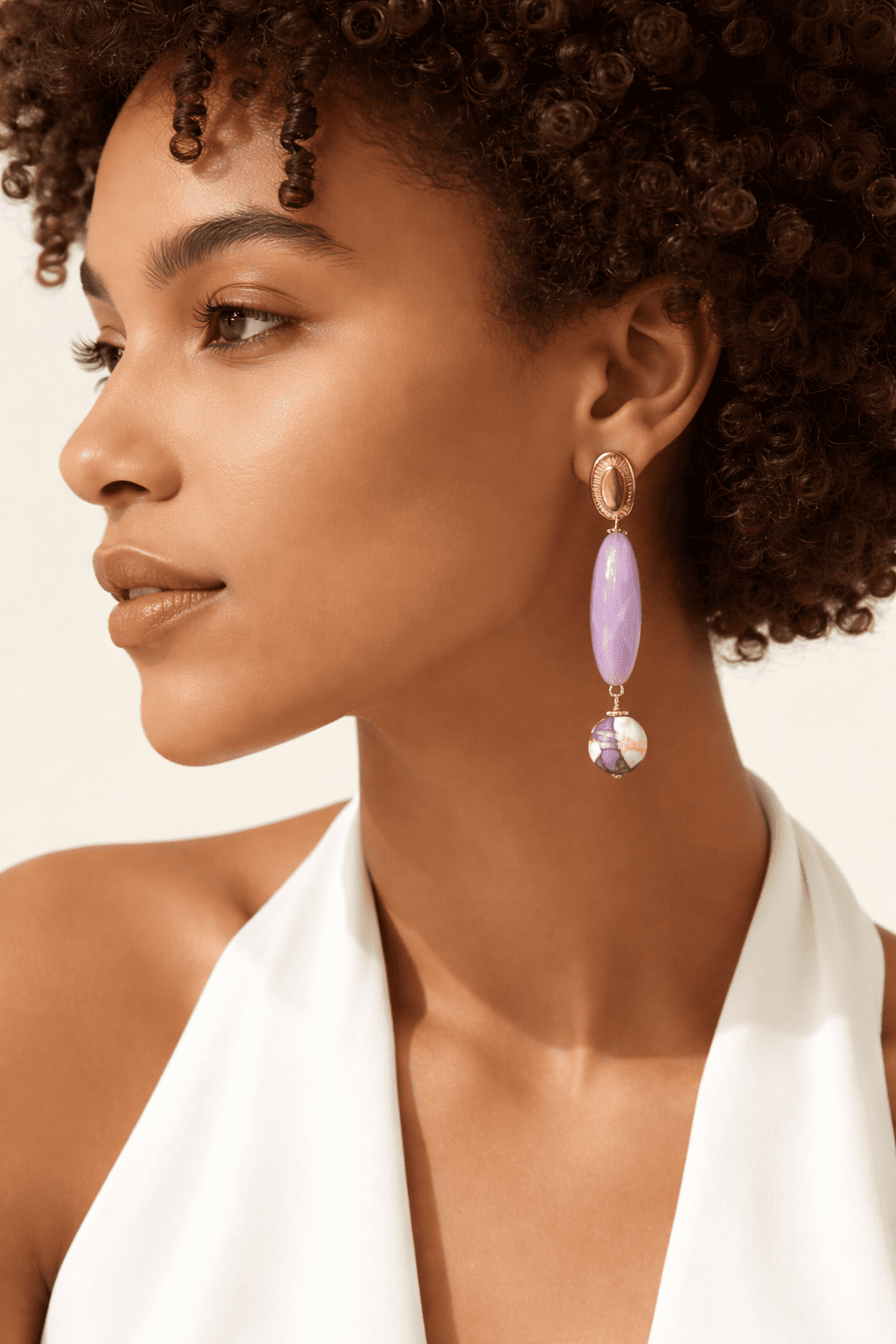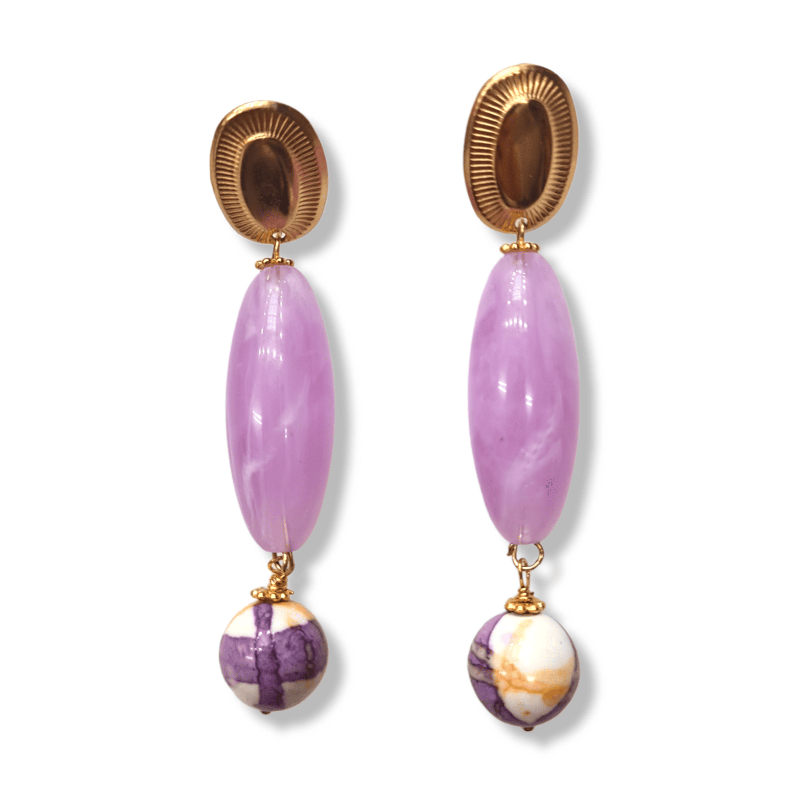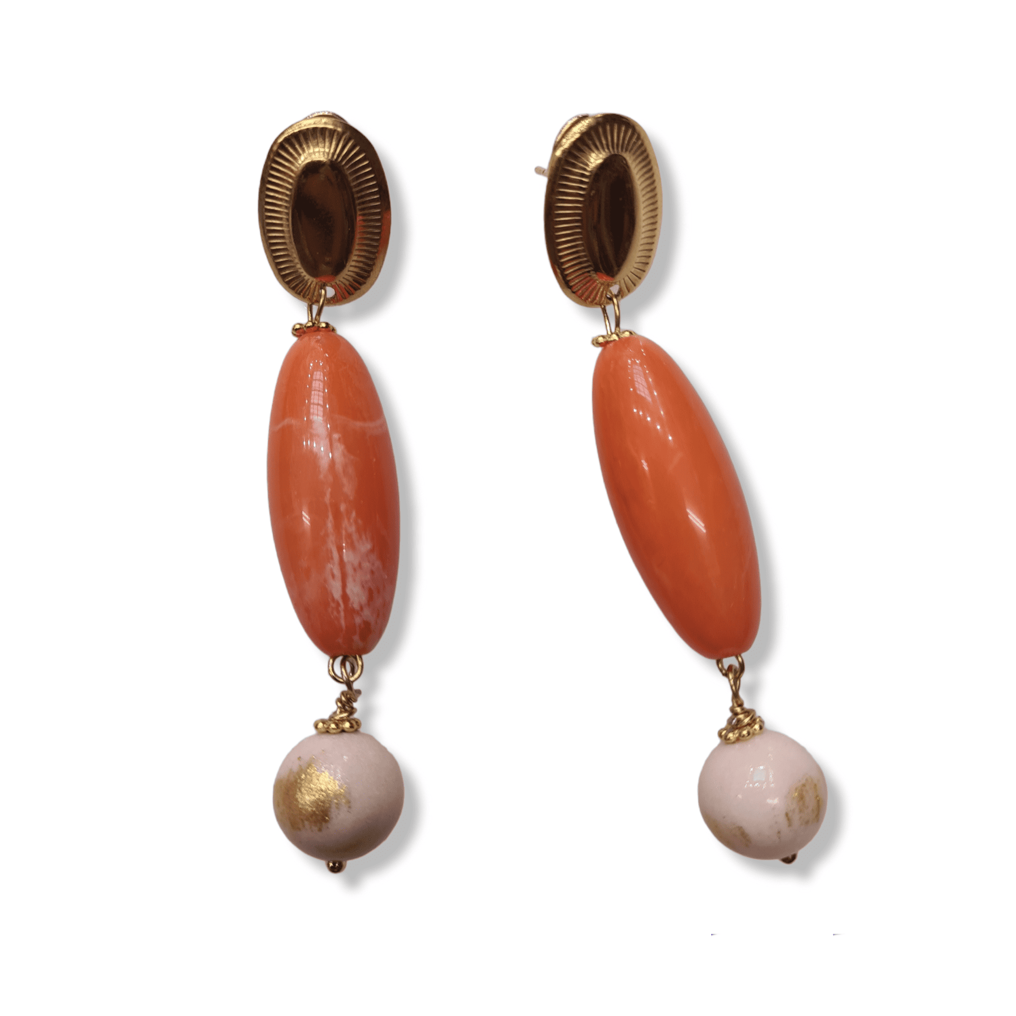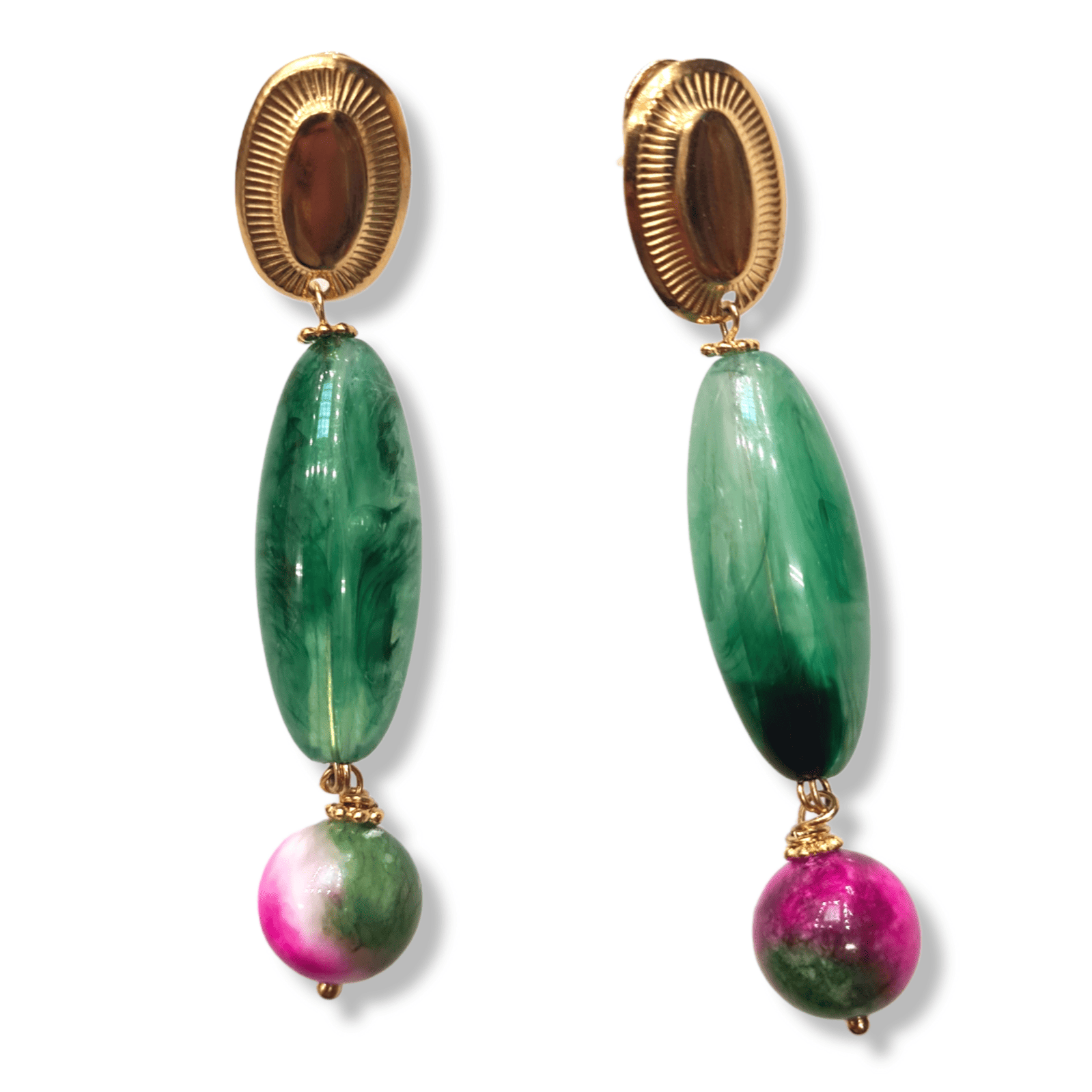 Este modelo destaca por su bonita forma: una base en dorado envejecido con textura, una bolita bicolor decorativa y una lágrima colgante en tono semitransparente que aporta movimiento y luminosidad al rostro. Gracias a su cierre tipo omega, se sujetan cómodamente sin necesidad de perforaciones, ofreciendo seguridad y confort durante todo el día.