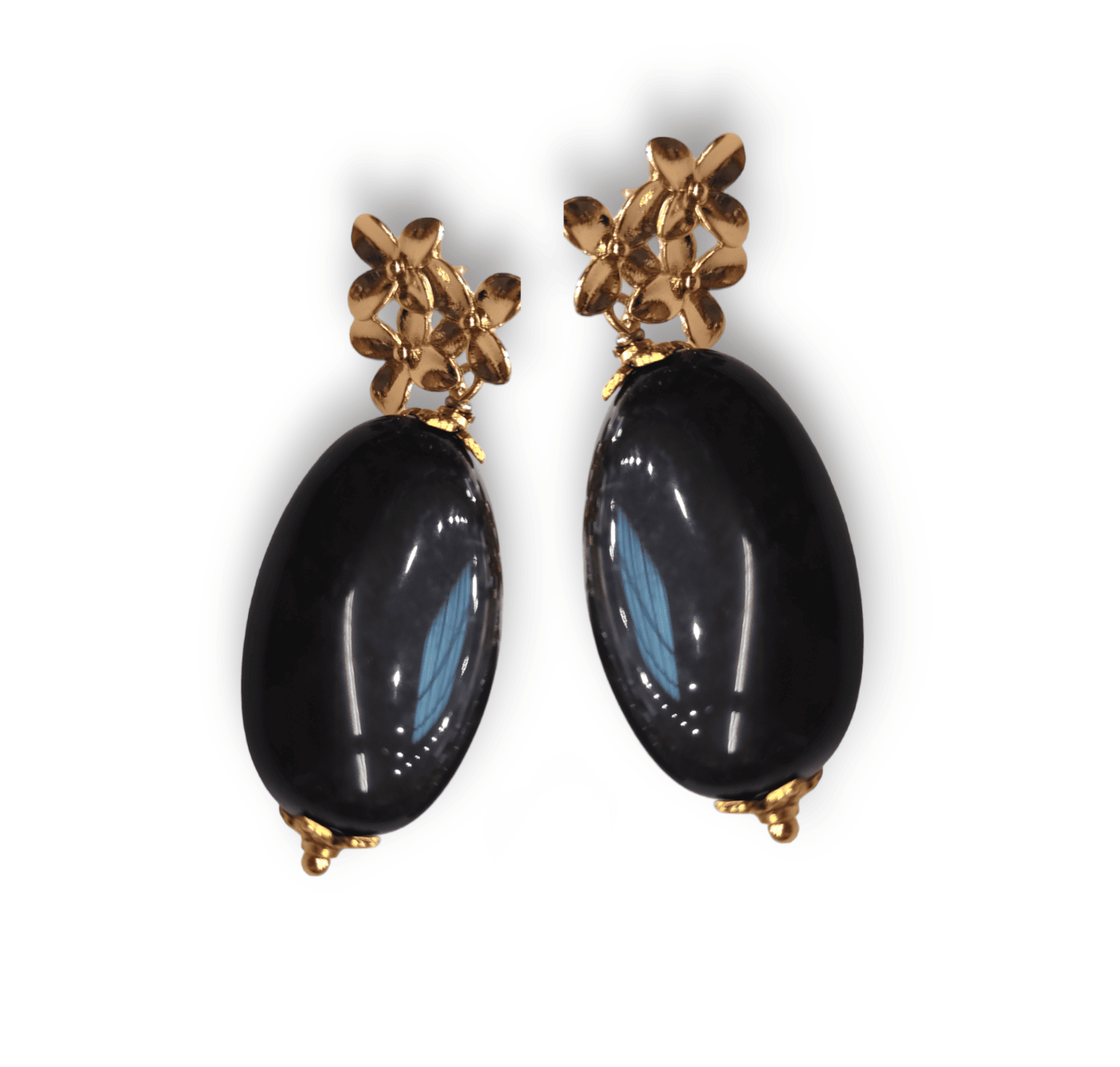 El pendiente Nashira es una pieza delicada y con mucha personalidad, perfecta para mujeres que buscan un accesorio elegante y original con esencia andaluza. Tiene un diseño sofisticado que combina una base dorada labrada con forma de flores y una piedra ovalada tornasolada, que refleja la luz con sutileza y aporta un efecto visual encantador.