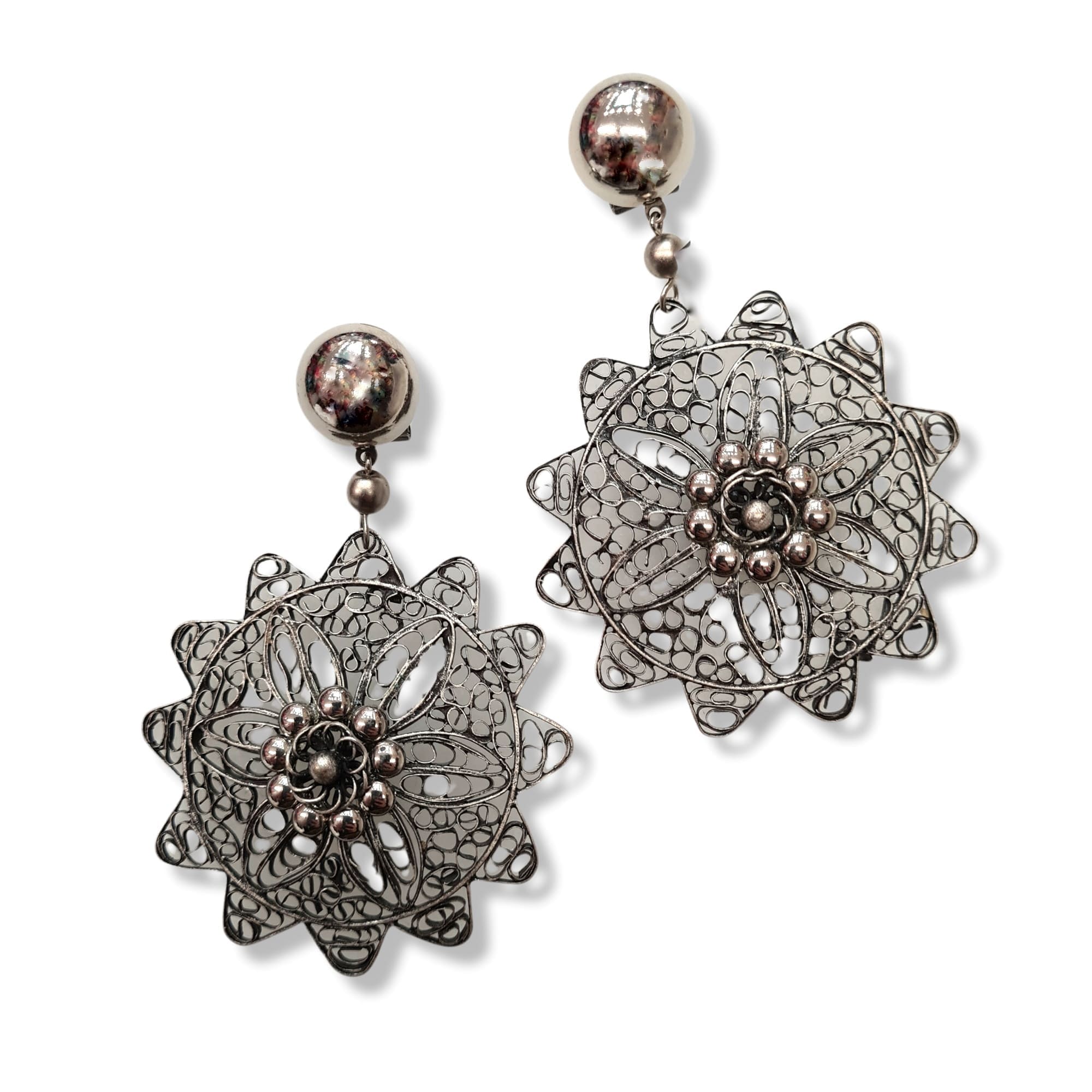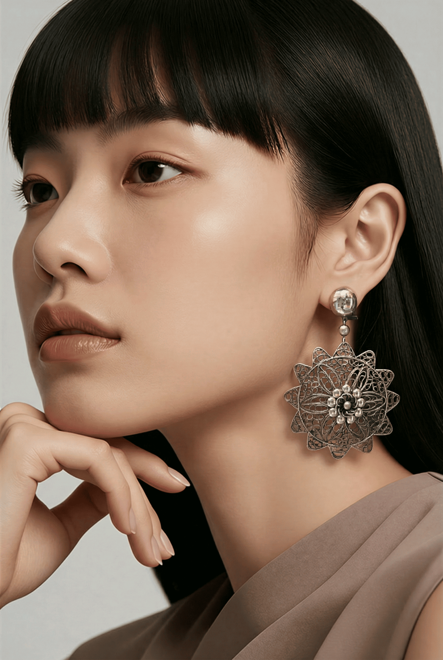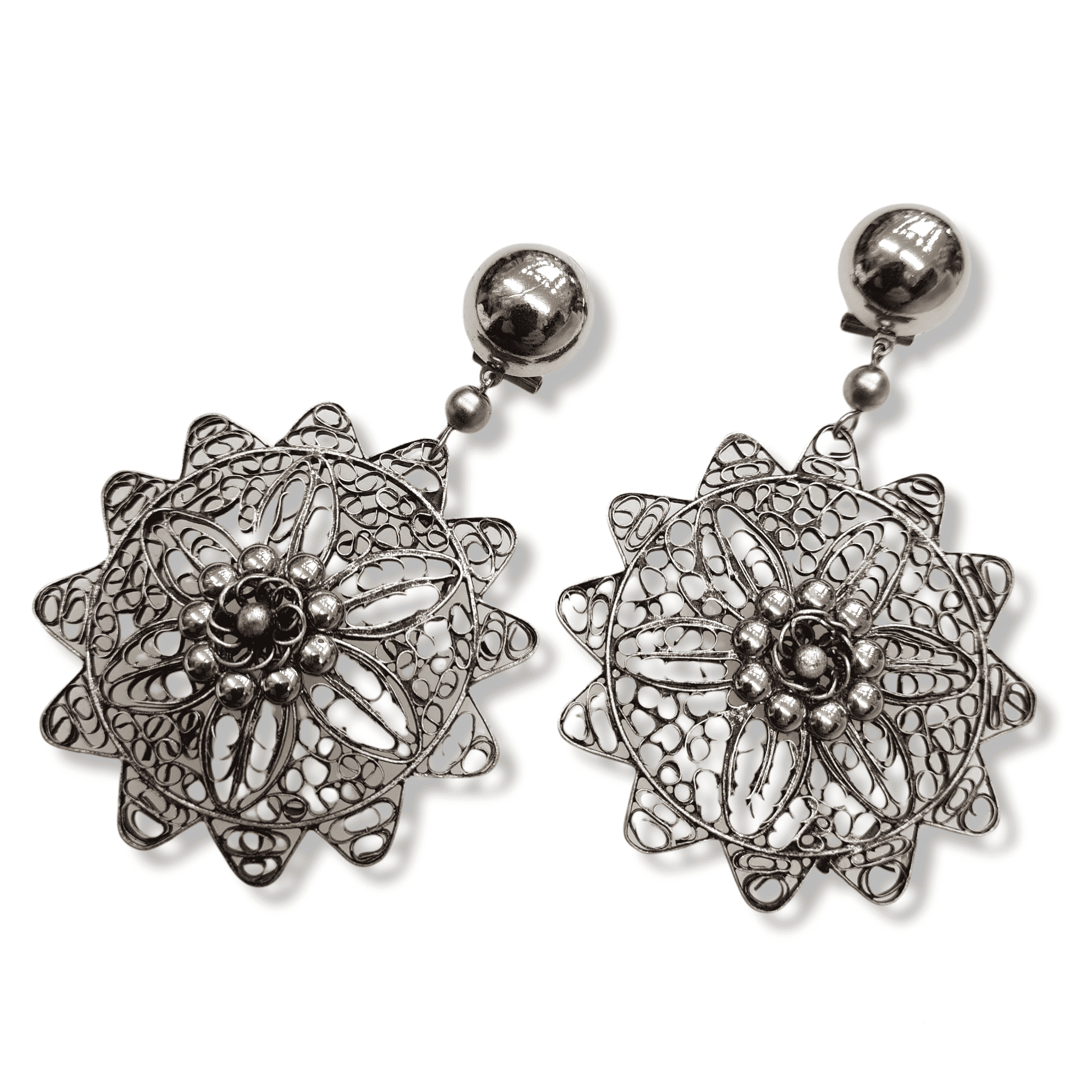 Descubre la elegancia floral del Pendiente Vakariné, una joya excepcional diseñada para destacar en eventos flamencos y ocasiones especiales. Con su exquisita forma de flor y su acabado plateado envejecido, este pendiente añade un toque de sofisticación y encanto a cualquier look.