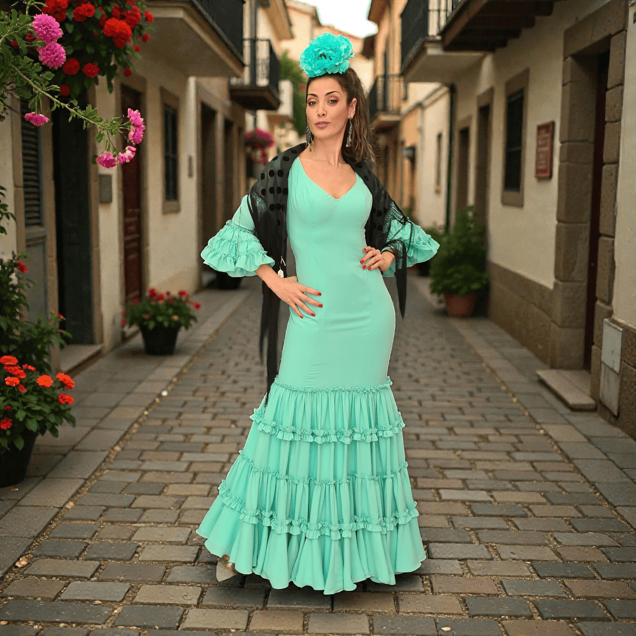 El traje de flamenca verde agua Julia es una pieza delicada y sofisticada, diseñada para mujeres que quieren proyectar elegancia, seguridad y feminidad en cada paso. Confeccionado en gasa, este vestido destaca por su ligereza, caída fluida y movimiento natural, convirtiéndose en una opción ideal para ferias y eventos especiales.