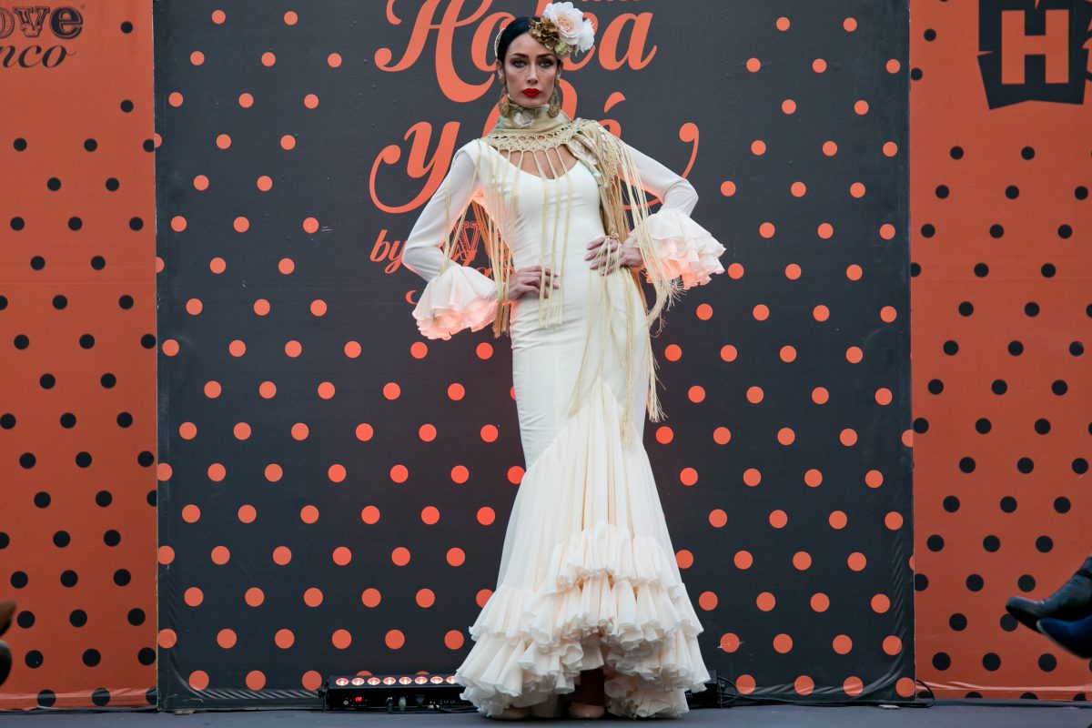 Vestido de novia flamenca de gasa, falda con recogido en un lado con tres volantes. Con escote redondo abierto y manga larga con volantes en el puño.