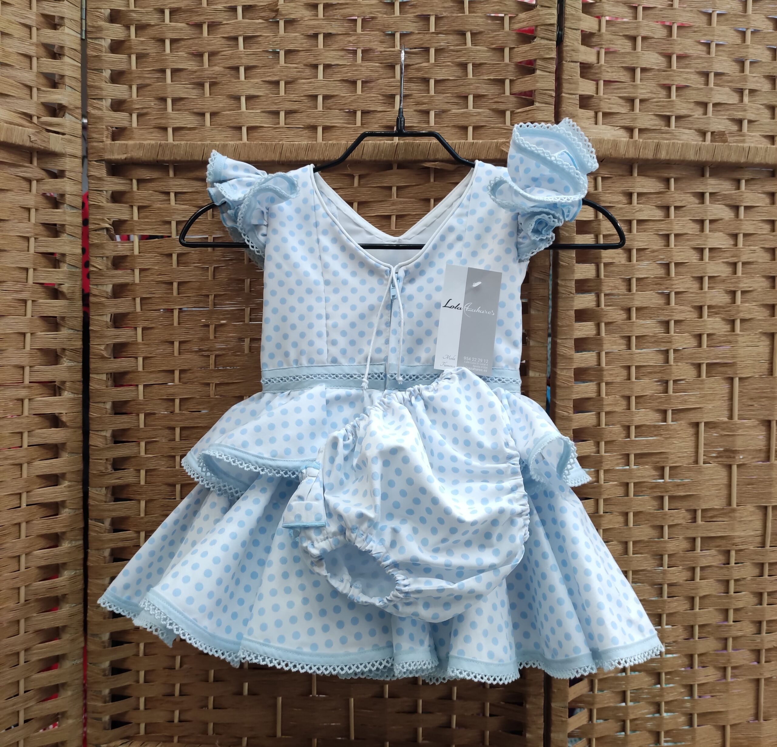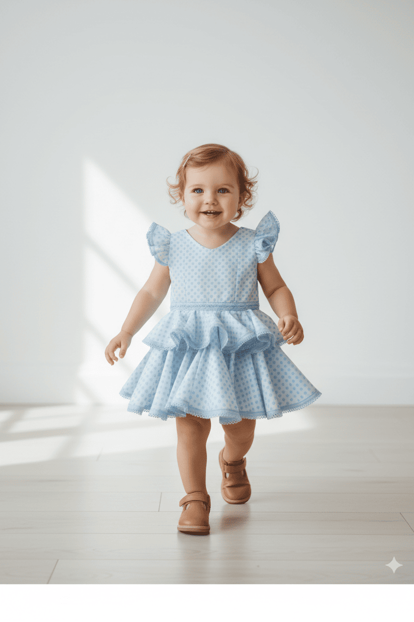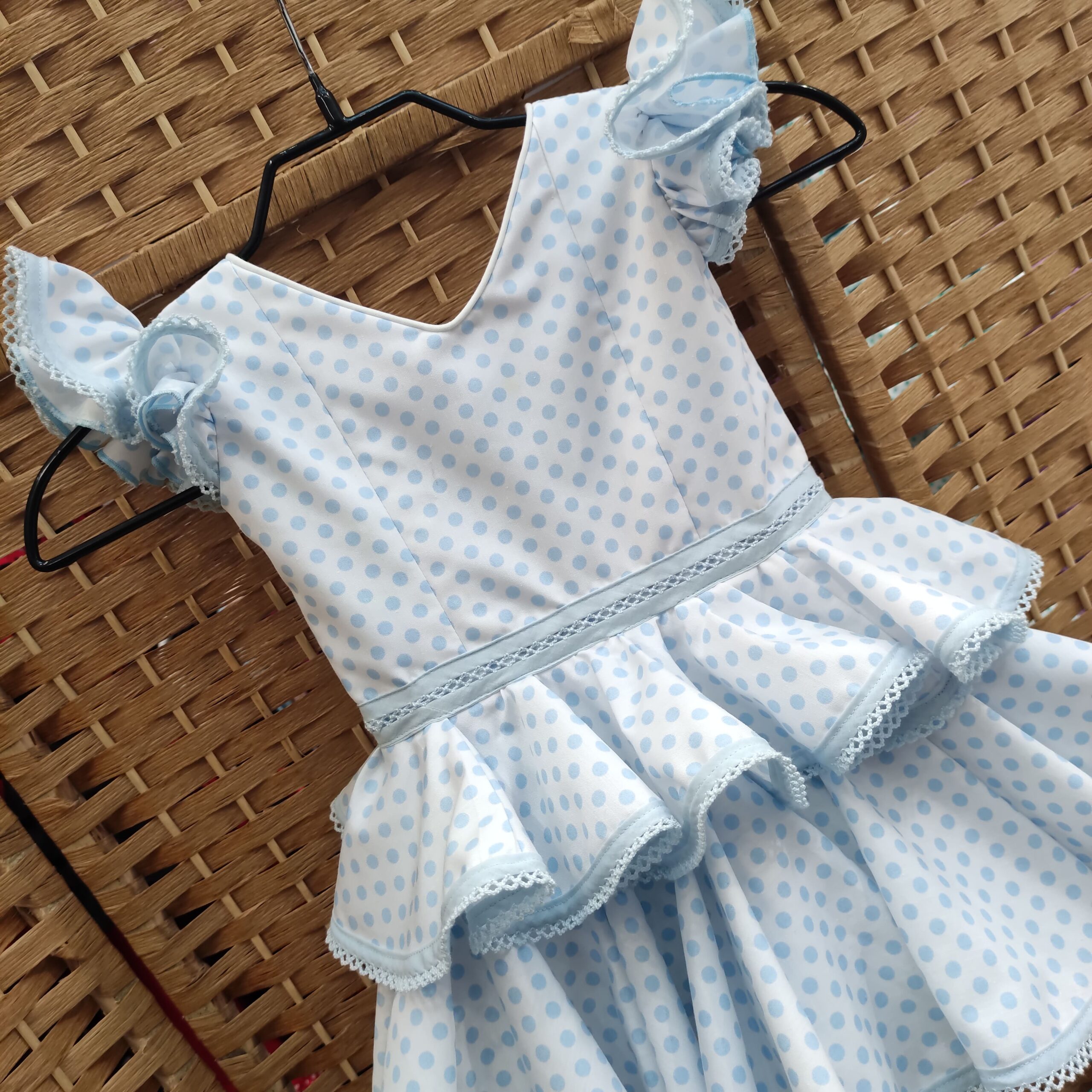 El Vestido de flamenca de bebé celeste Ranita es una opción adorable y muy cómoda para las más pequeñas. Confeccionado en popelín de alta calidad, ofrece suavidad, ligereza y resistencia, ideal para acompañar a tu bebé durante ferias, romerías o celebraciones especiales. El diseño está completamente forrado para mayor confort y cuenta con braguita cubre pañal a juego, además de un práctico bolsillo.
