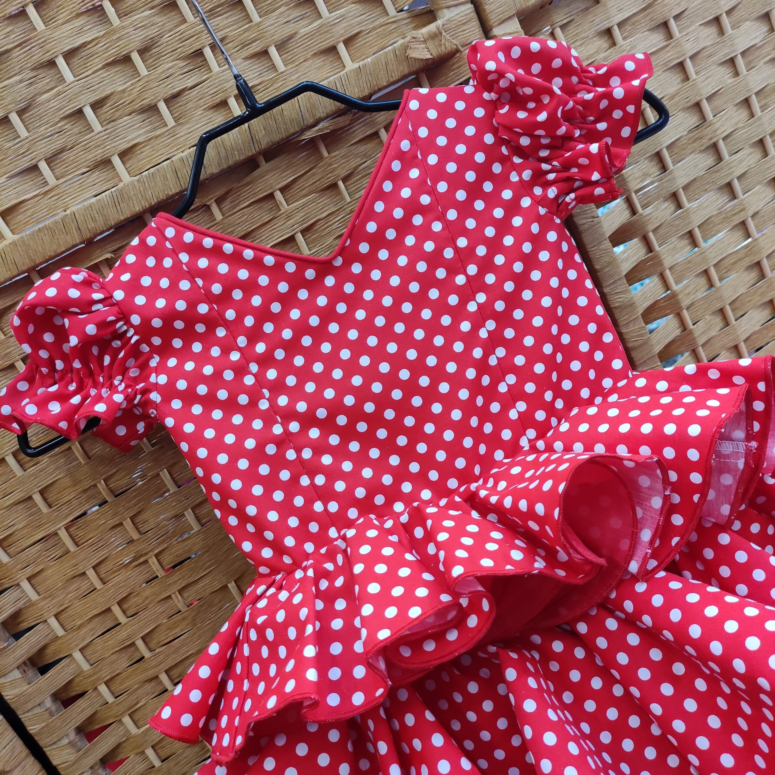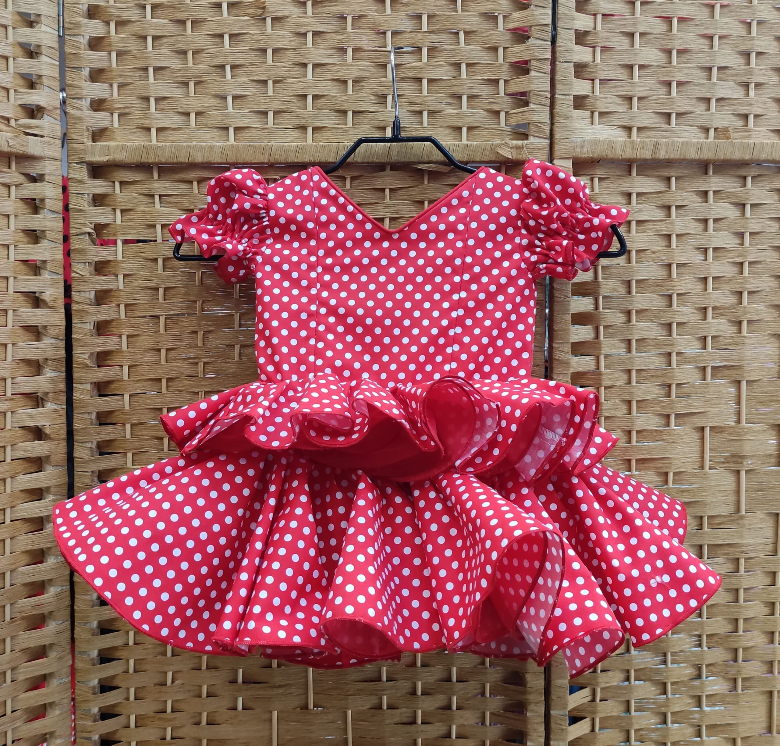 Presenta corte en la cintura y un largo hasta medio muslo, lo que permite libertad de movimiento y frescura. La falda incorpora dos volantes superpuestos, uno más largo y otro más corto, que aportan volumen y ese movimiento tan característico del traje flamenco.