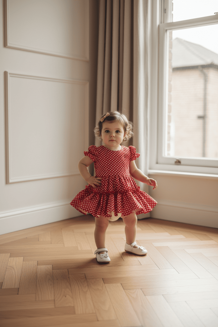 El escote de pico añade un toque tradicional y elegante, mientras que las mangas de farolillo aportan dulzura y estilo, enmarcando los hombros con un acabado muy favorecedor. Cada detalle está pensado para combinar estética y funcionalidad, asegurando que tu bebé esté cómoda y preciosa al mismo tiempo.