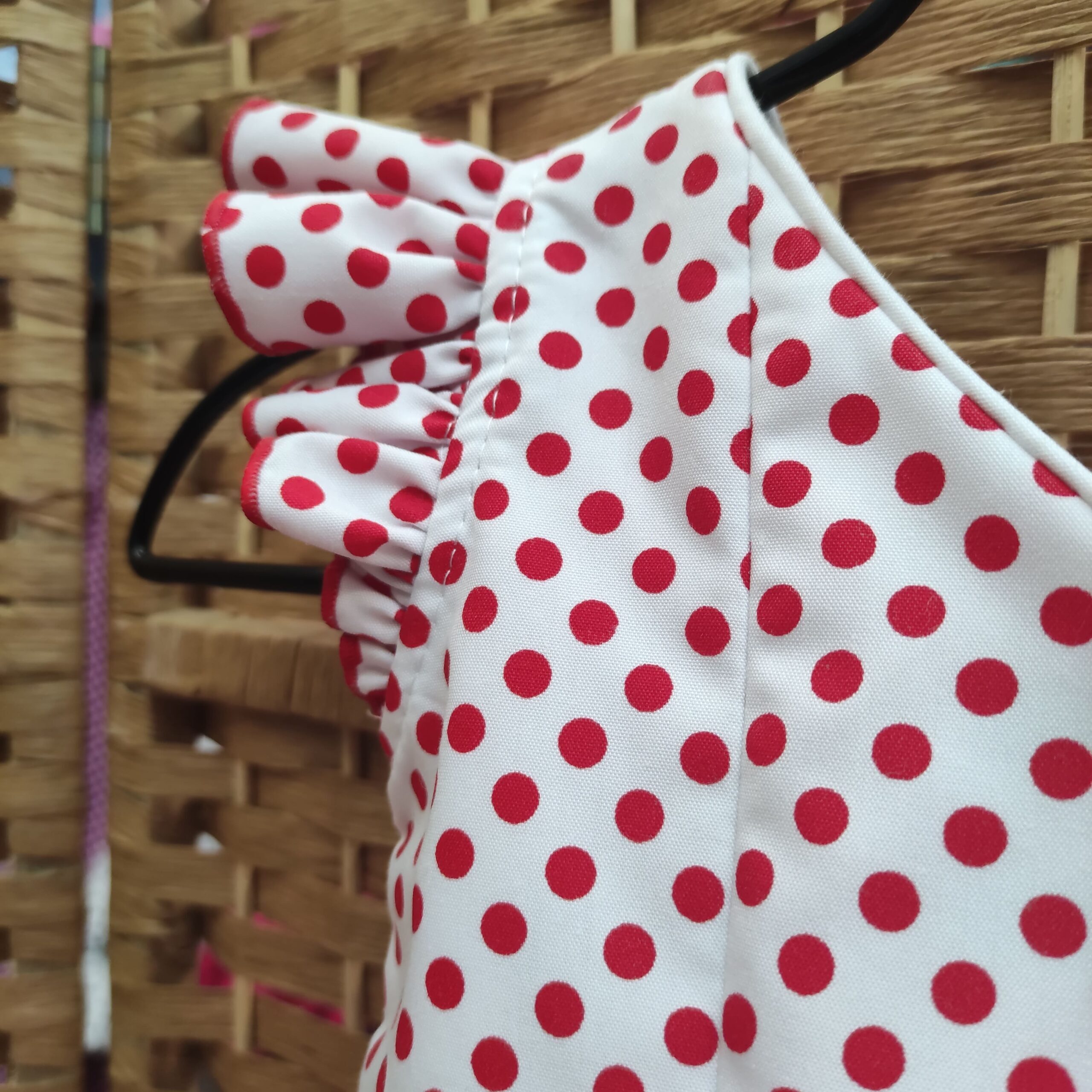 Incluye braguitas a juego para cubrir el pañal, combinando estética y practicidad. Además, presenta escote de pico tanto en la parte delantera como en la trasera, lo que estiliza el diseño y aporta un toque elegante sin perder la dulzura propia de un traje de bebé.