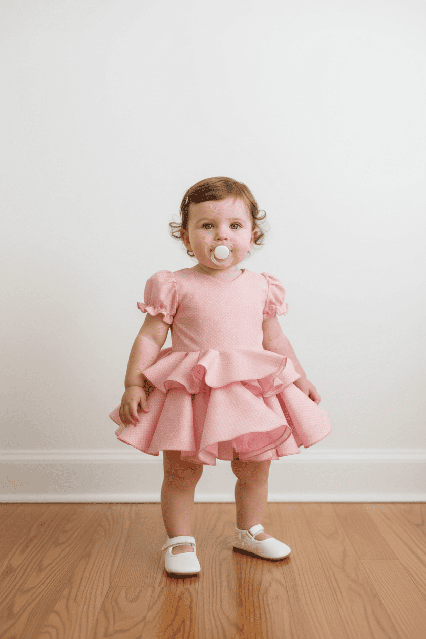 El escote de pico añade un toque tradicional y elegante, mientras que las mangas de farolillo aportan dulzura y estilo, enmarcando los hombros con un acabado muy favorecedor. Cada detalle está pensado para combinar estética y funcionalidad, asegurando que tu bebé esté cómoda y preciosa al mismo tiempo.