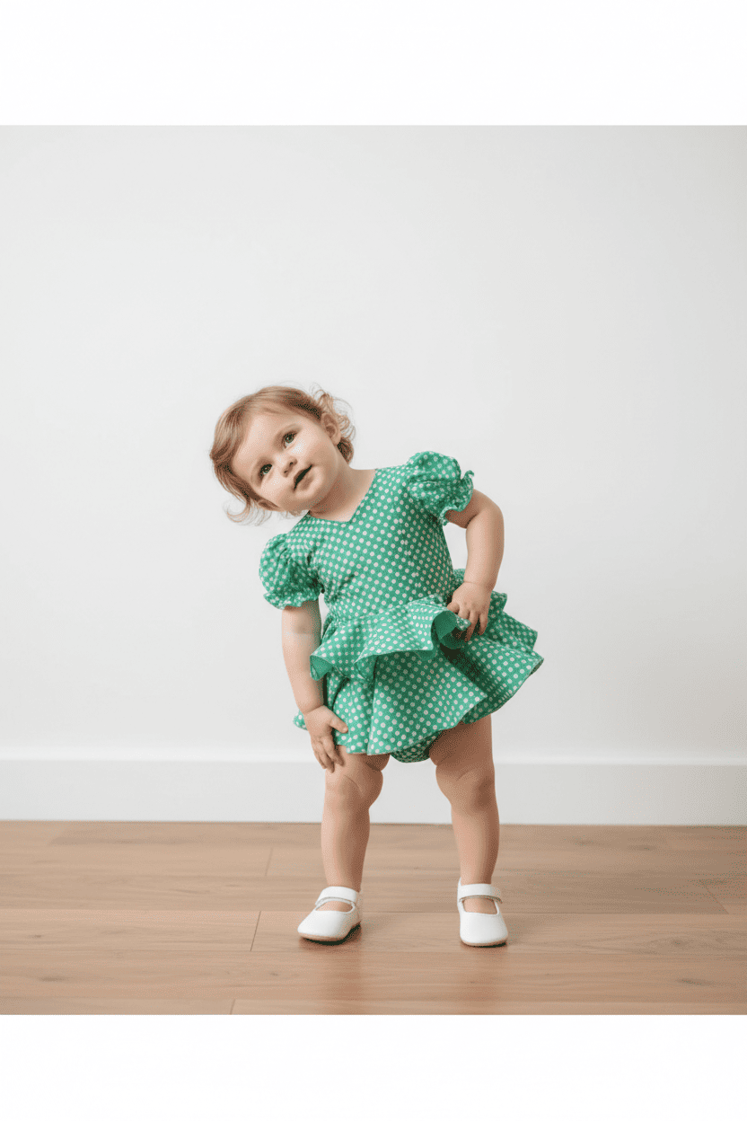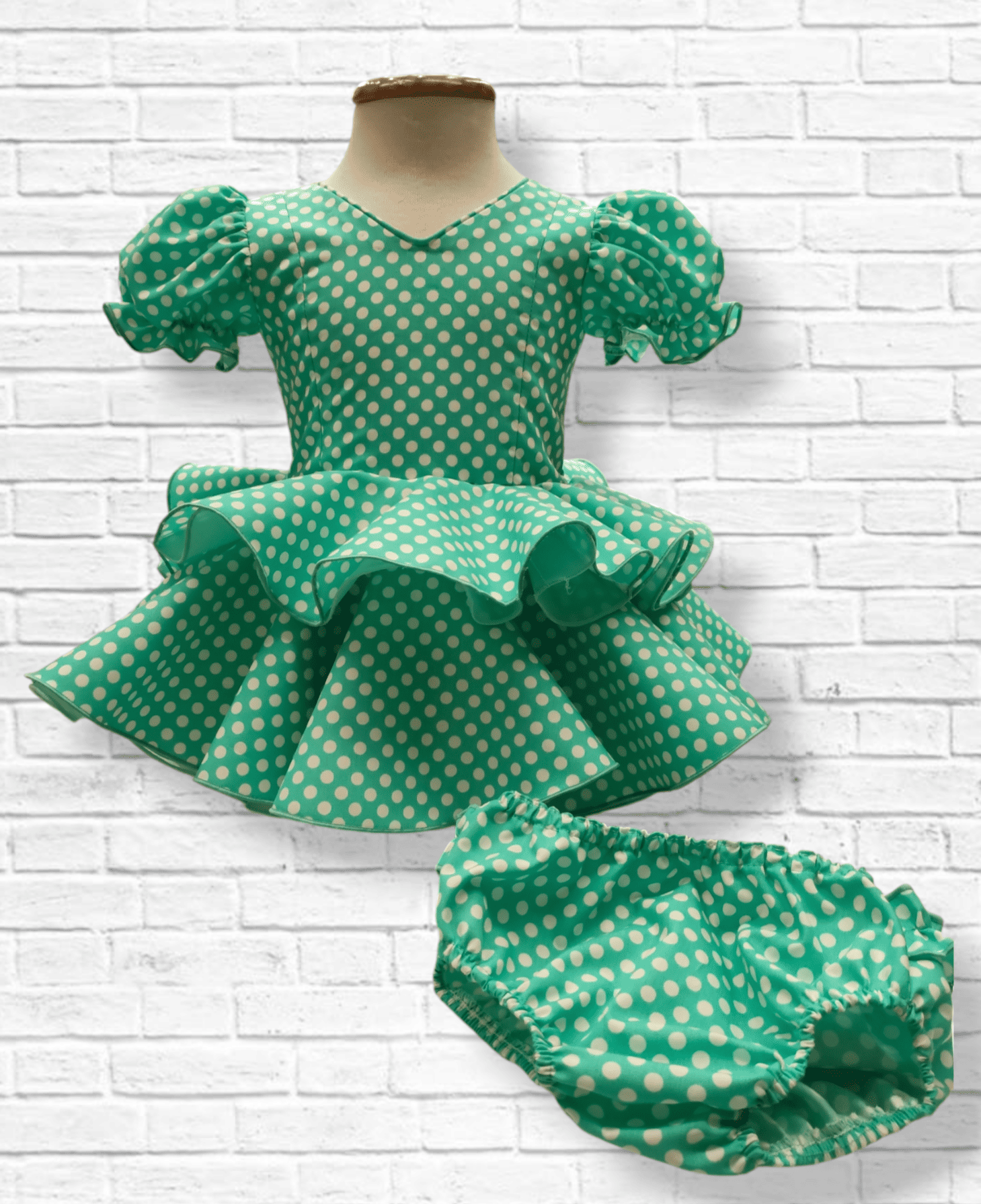 El Vestido de flamenca de bebé verde agua Ranita es una opción adorable y muy cómoda para las más pequeñas. Confeccionado en popelín de alta calidad, ofrece suavidad, ligereza y resistencia, ideal para acompañar a tu bebé durante ferias, romerías o celebraciones especiales. El diseño está completamente forrado para mayor confort y cuenta con braguita cubre pañal a juego, además de un práctico bolsillo.